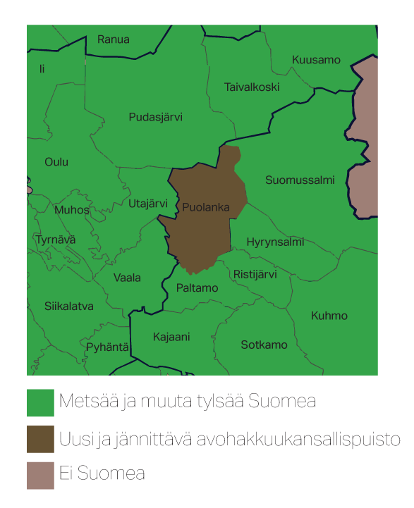 Kainuun unohdetuimpaan kuntaan Puolangalle suunniteltu avohakkuukansallispuisto tulee valmistuttuaan kattamaan koko Puolangan kunnan alueen (2598 km2), ja siten se tulee olemaan pinta-alaltaan Suomen toiseksi suurin kansallispuisto heti Lemmenjoen kansallispuiston jälkeen. Hankkeen keskeinen tavoite on kaataa kaikki Puolangan metsät pois, jolloin koko Puolangasta tulee maailman suurin hakkuuaukea (2598 km2).